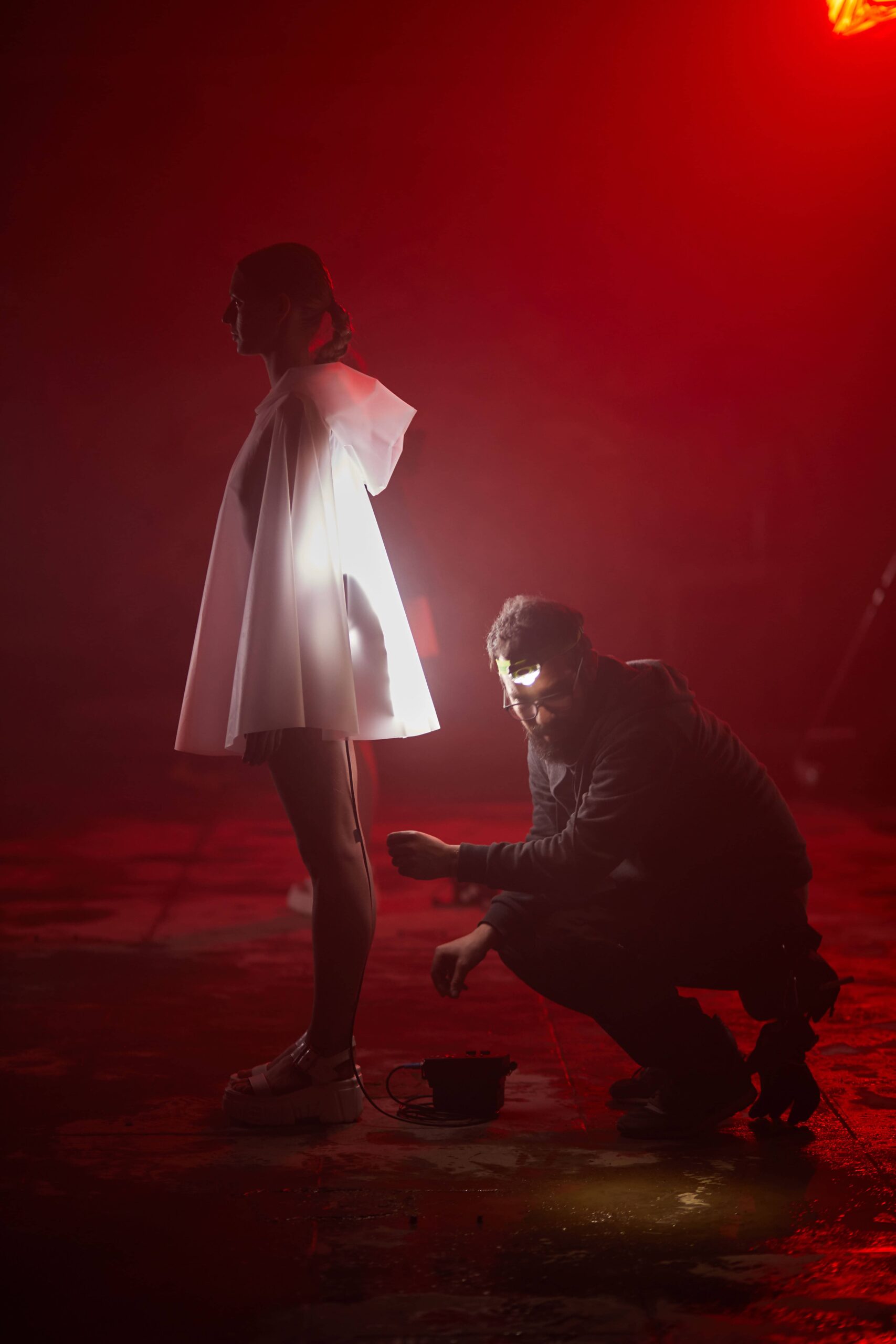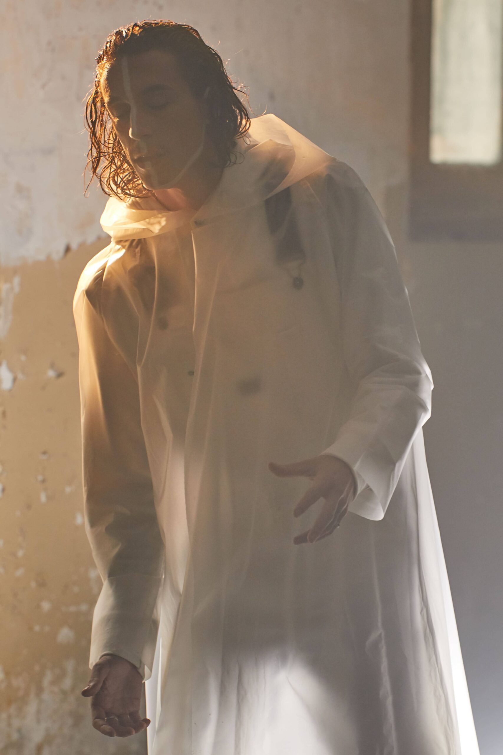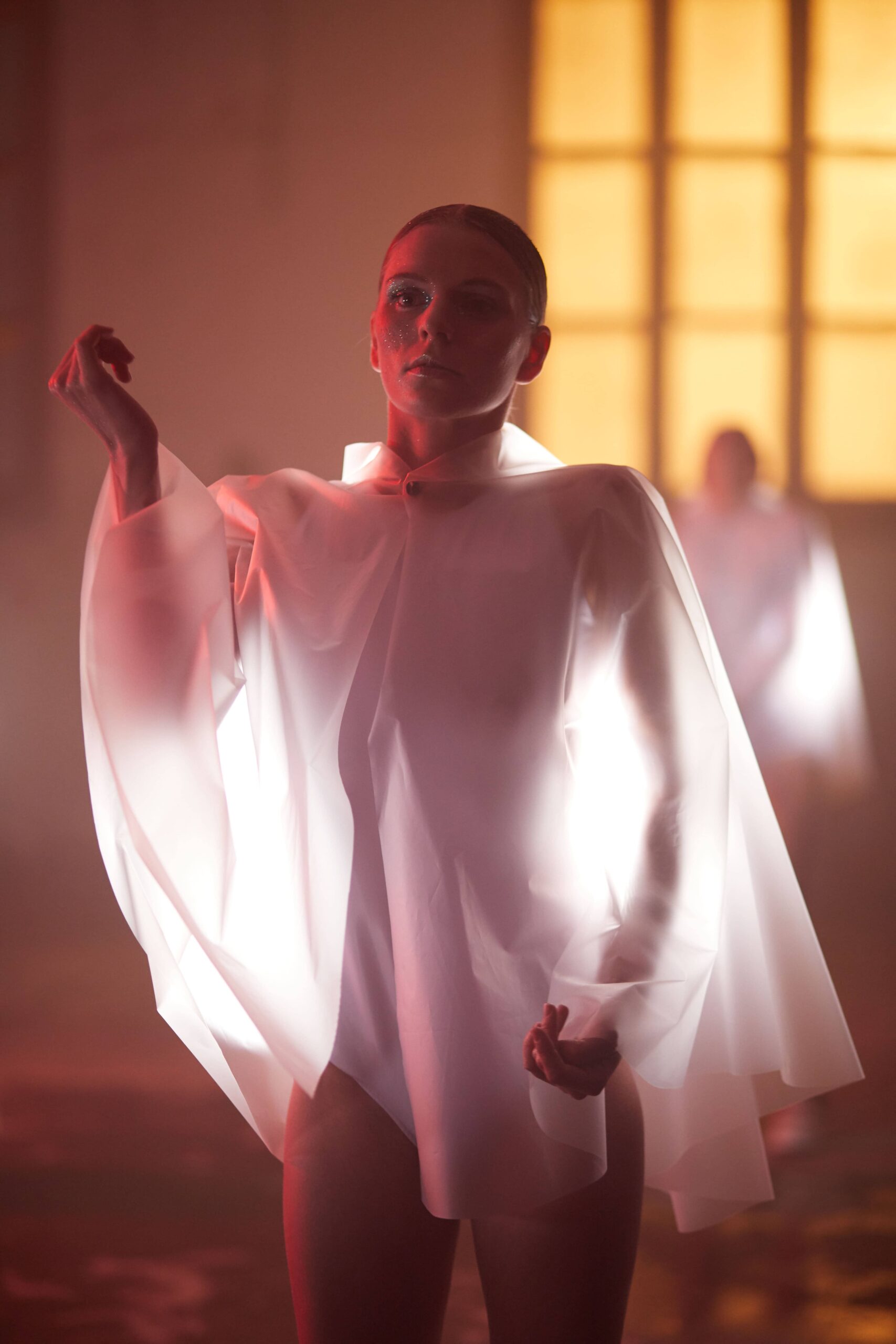 Abrigo oversize confeccionado en plástico alimentario a conjunto con las capas para el resto del cuerpo de baile realizados para el videoclip de Hermanita de Lucas Bun. 2020